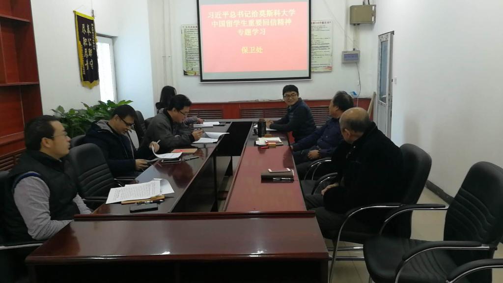 2018年1月22日下午,保卫处党支部召开会议,深入学习贯彻习近平总书记给莫斯科大学中国留学生重要回信精神。支部党员张成银、宗文艺,郭俭,钱凯,杨威、马洪青、杨静参加会议。保卫处党支部书记张涛主持会议并宣读习近平总书记给莫斯科大学中国留学生重要回信,支部成员结合自己的学习经历谈感受。
